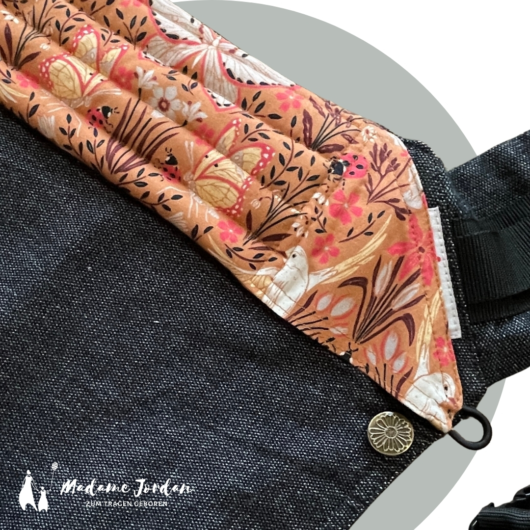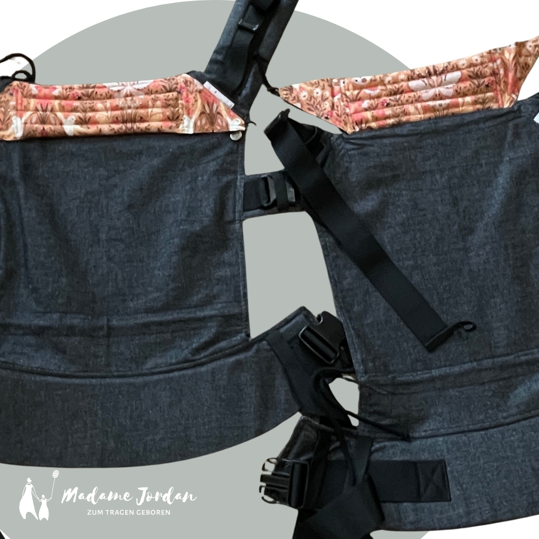 Unsere Trage ist besonders kuschelig, aber gleichzeitig stabil und sicher. Die Trage bietet Platz für ein Kind auf dem Rücken, während das andere bei Bedarf vorne an der anderen Trage befestigt werden kann.