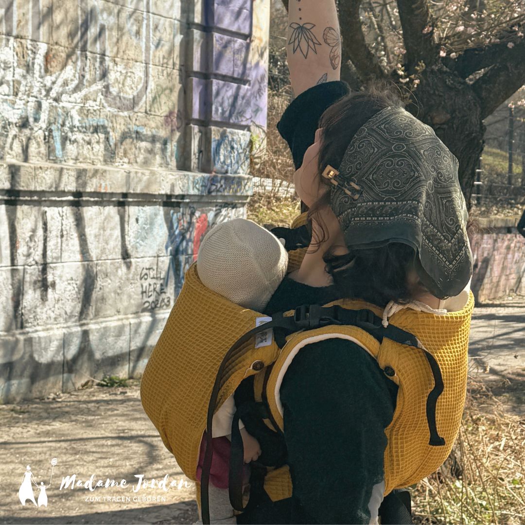 Unsere innovative Lösung für Eltern von Zwillingen bietet sowohl Komfort als auch Funktionalität. Mit unserer Trage kannst Du ganz einfach ein Kind auf deinem Rücken tragen, während das andere je nach Bedarf vor deinem Bauch ruht. Selbst wenn Du nur ein Kind tragen magst, ermöglicht unsere Trage eine bequeme Möglichkeit, es vor deinem Bauch schlummern zu lassen.