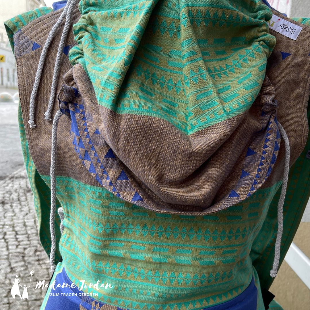 Die Madame Jordan Wrap Conversion Mei Tai Halfbuckle ( = Tragehilfe mit Hüftgurt mit Schnalle und Trägern zum Binden) ist eine äußerst praktische Kombination aus Tragetuch und Tragehilfe. Die Bequemlichkeit und Flexibilität eines Tragetuches wird gemixt mit dem leichten und bequemen Anlegen einer Tragehilfe. Sie sorgt mit dem stabilen aber ergonomischen Hüftgurt und den breiten Trägern für ein entspanntes Tragen in allen Gewichtsklassen. Eure Traglinge genießen den weichen Stoff aus Biobaumwolle der sich um ihren und euren Körper schmiegt. Die Kopfstütze dient als Sonnenschutz, Rückenteilverlängerung, Stabilisierung als Nackenrolle oder einfach als geschützten Rückzugsort für das tägliche Schläfchen.