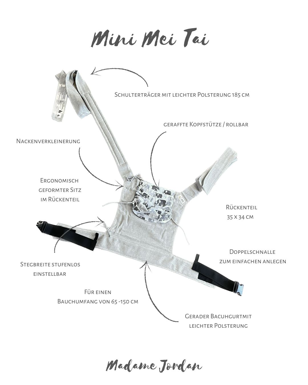Unser Mini Mei Tai ist die einfachste Tragehilfe ab Geburt, wenn ihr noch nicht wisst ob Tragen etwas für Euch ist oder ihr unsicher seit, welche Trage es wirklich sein soll. Ansonsten auch sehr beliebt bis 'die' Tragehilfe dann richtig passt, da nicht jede Tragehilfe ab Geburt geeignet ist.