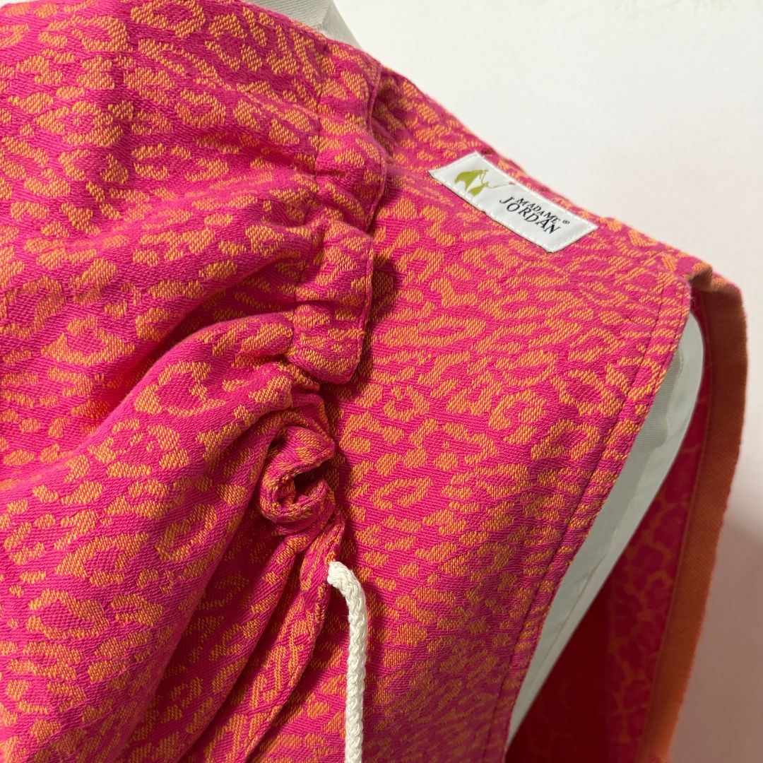 Die Madame Jordan Wrap Conversion Mei Tai Halfbuckle ( = Tragehilfe mit Hüftgurt mit Schnalle und Trägern zum Binden) ist eine äußerst praktische Kombination aus Tragetuch und Tragehilfe. Die Bequemlichkeit und Flexibilität eines Tragetuches wird gemixt mit dem leichten und bequemen Anlegen einer Tragehilfe. Sie sorgt mit dem stabilen aber ergonomischen Hüftgurt und den breiten Trägern für ein entspanntes Tragen in allen Gewichtsklassen. Eure Traglinge genießen den weichen Stoff aus Biobaumwolle der sich um ihren und euren Körper schmiegt. Die Kopfstütze  dient als Sonnenschutz, Rückenteilverlängerung, Stabilisierung als Nackenrolle oder einfach als geschützten Rückzugsort für das tägliche Schläfchen.
