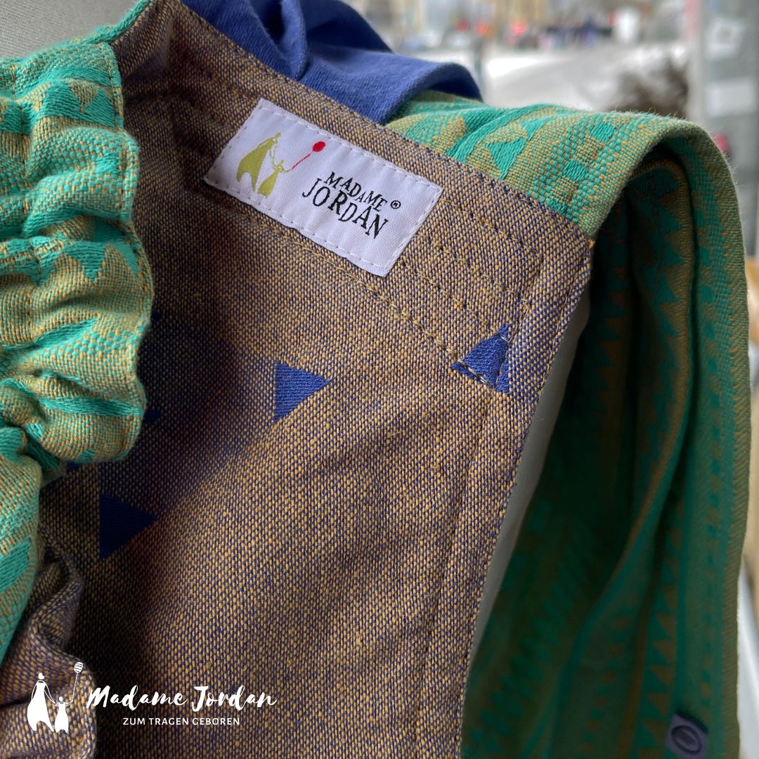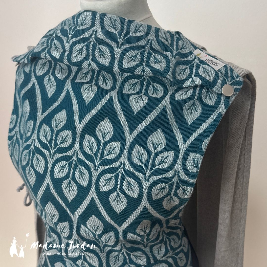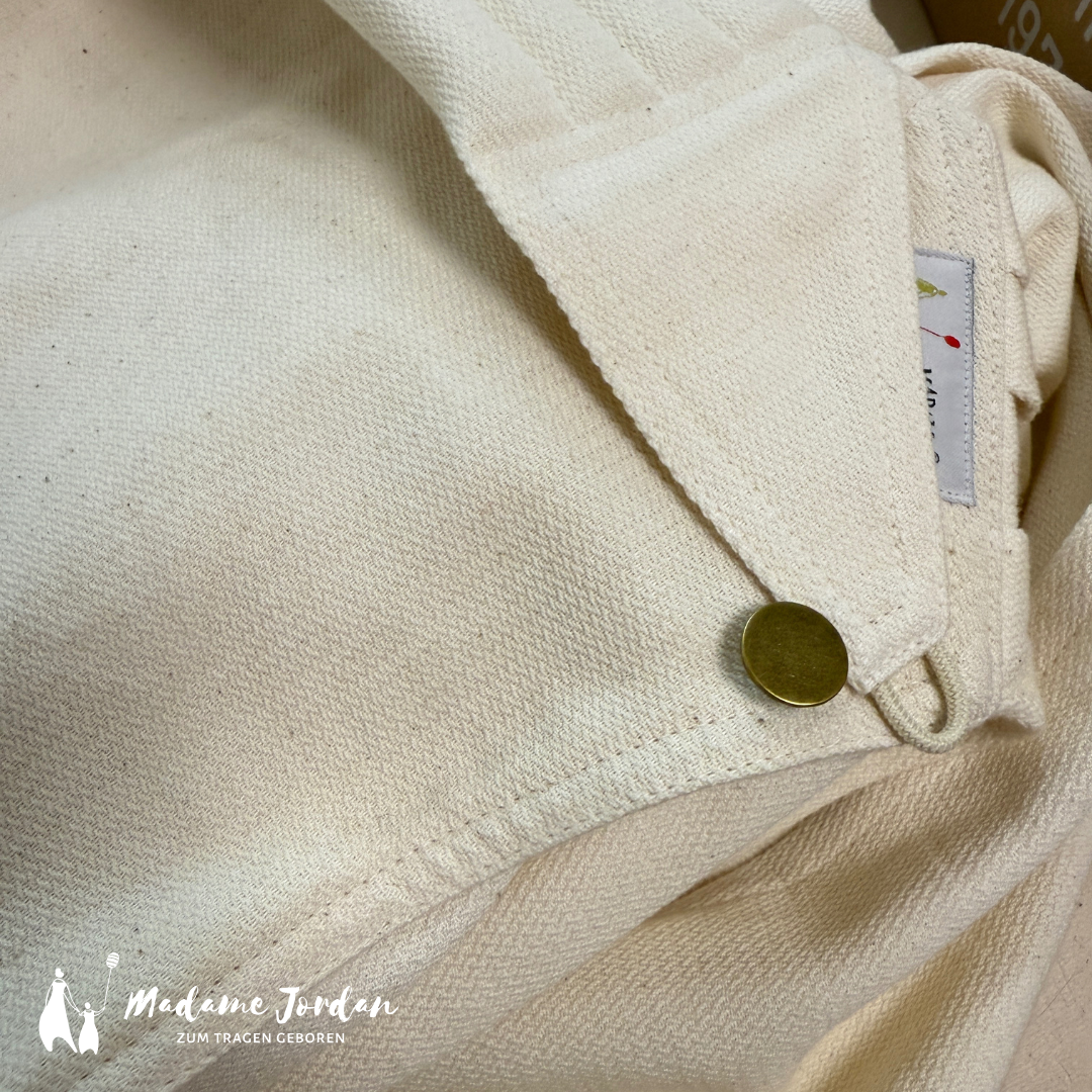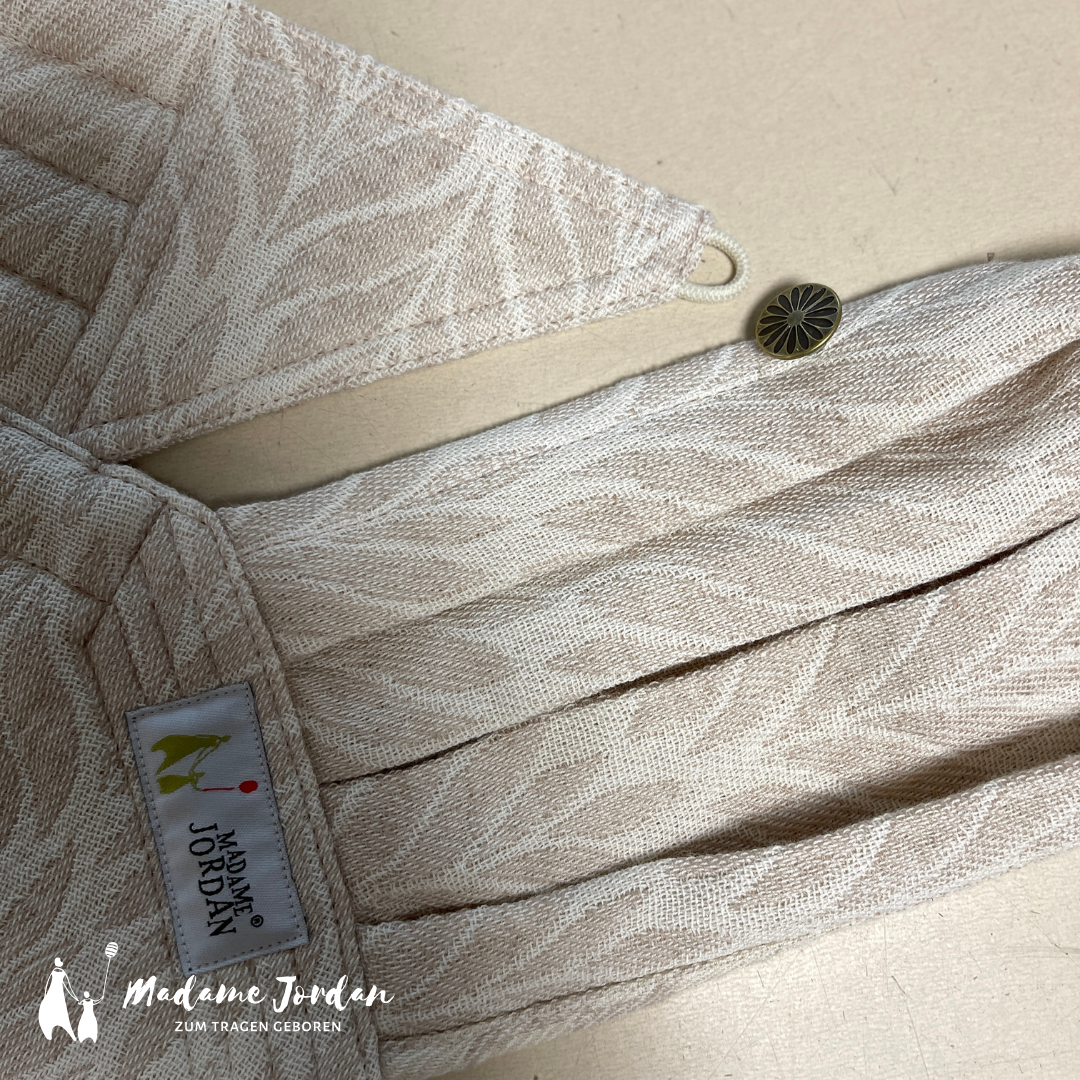 Die Madame Jordan Wrap Conversion Mei Tai Halfbuckle ( = Tragehilfe mit Hüftgurt mit Schnalle und Trägern zum Binden) ist eine äußerst praktische Kombination aus Tragetuch und Tragehilfe. Die Bequemlichkeit und Flexibilität eines Tragetuches wird gemixt mit dem leichten und bequemen Anlegen einer Tragehilfe. Sie sorgt mit dem stabilen aber ergonomischen Hüftgurt und den breiten Trägern für ein entspanntes Tragen in allen Gewichtsklassen. Eure Traglinge genießen den weichen Stoff aus Biobaumwolle der sich um ihren und euren Körper schmiegt. Die Kopfstütze dient als Sonnenschutz, Rückenteilverlängerung, Stabilisierung als Nackenrolle oder einfach als geschützten Rückzugsort für das tägliche Schläfchen.