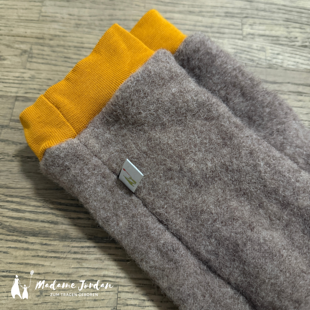 Passend zu unseren Babyschuhen gibt es eine kleine Kollektion an Stulpen aus kuscheligen Wollfleece und Bündchen in Biobaumwolle. Als zusätzliche Lage über Legging usw. unterm Tragecover oder der Tragejacke ist dein Kind besonders an den Beinen nochmal extra geschützt. Wollfleece hat eine besonders hohe Wärme und ist dabei besonders weich, kuschelig und leicht.