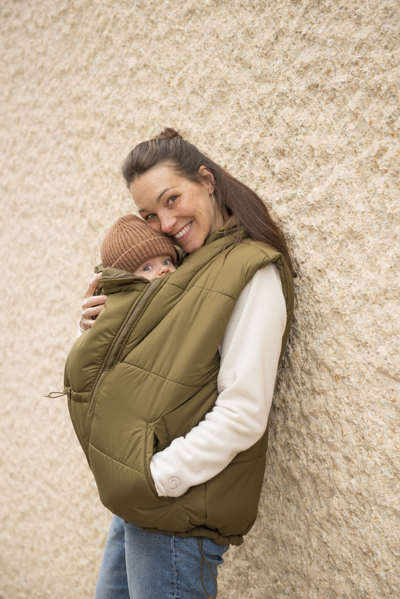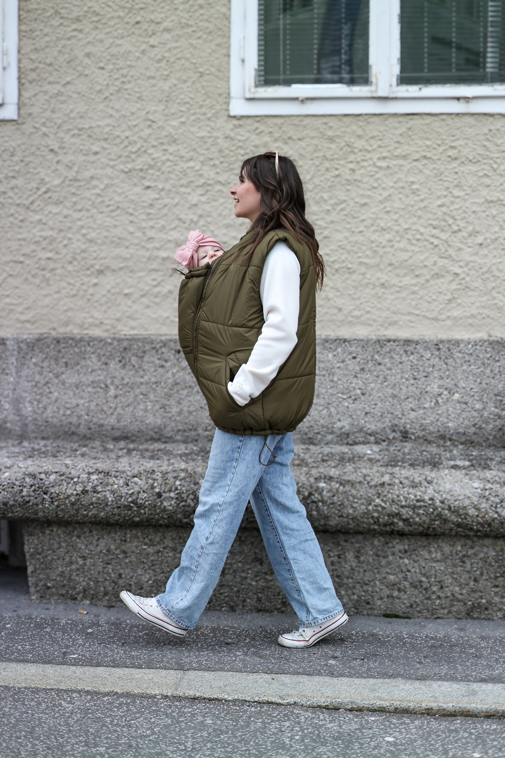 Diese angesagte Weste zum Babytragen kannst du auf vielfältige Weise nutzen: für die Schwangerschaft, zum Babytragen vorne, und auch zum Tragen auf dem Rücken. Dank dem Oversized-Look bist du nicht nur modisch mit oder ohne Baby unterwegs, auch der Papa kann die Weste als Trageweste benutzen.