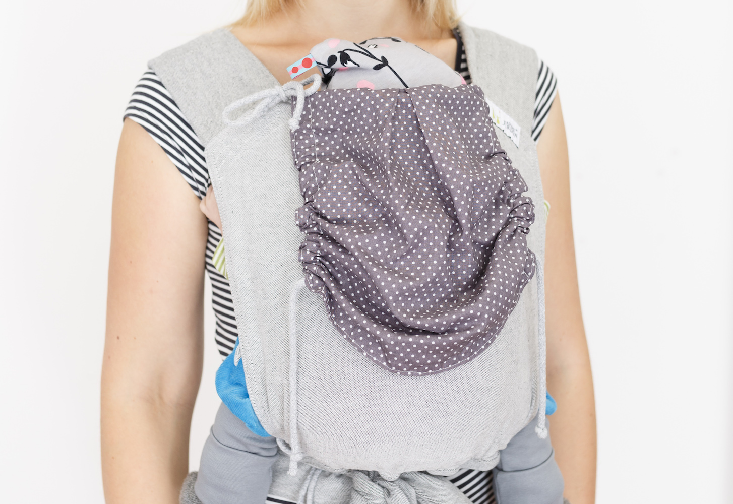 Mit den Enden kannst Du extra den Kopf deiner Babys stützen indem diese gerollt und hinterm Kopf im Beutel fixiert wird oder in die obere Kante eingerollt wird. Siehe dir dazu auch die Tipps beim normalen Ringsling an!