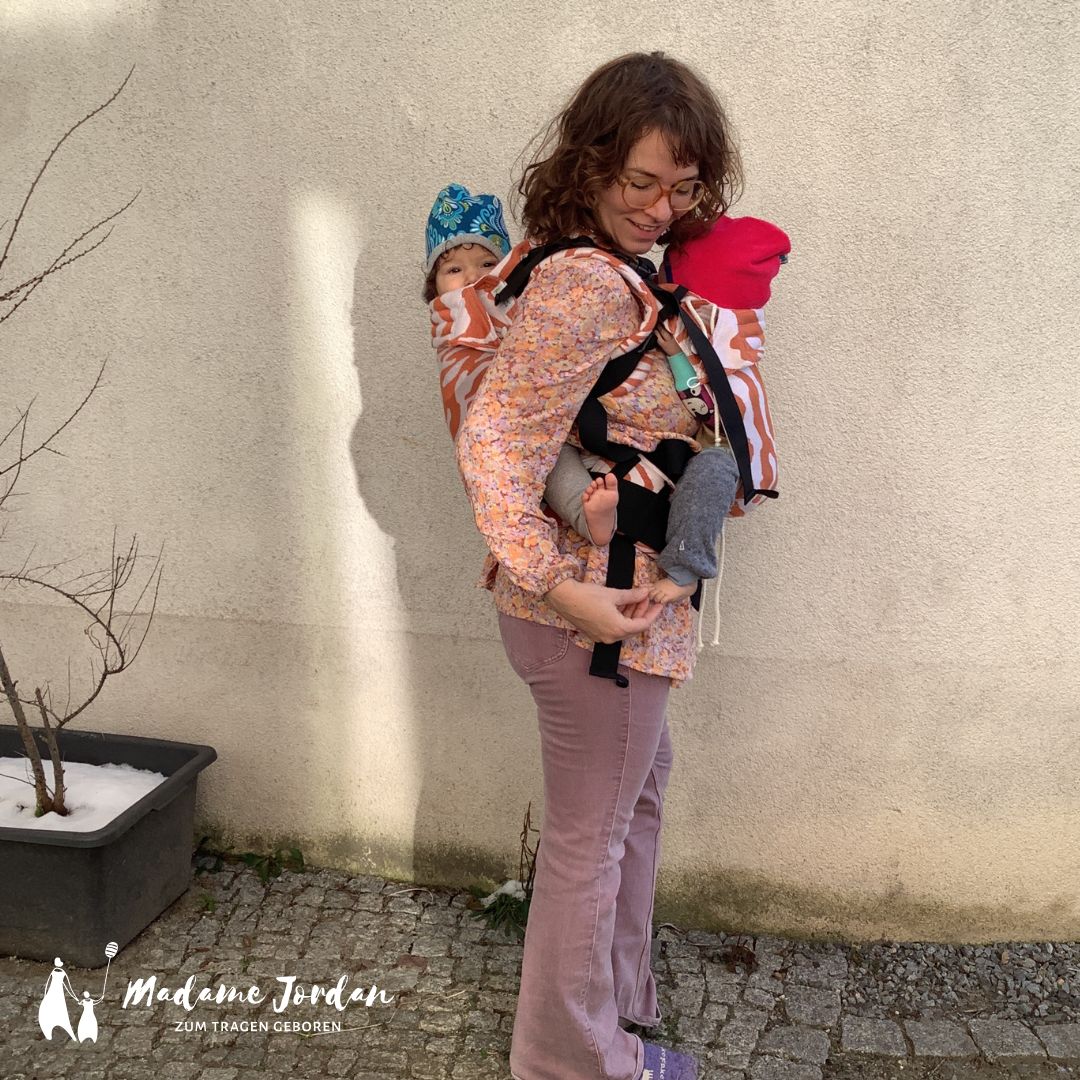 Unsere Trage ist besonders kuschelig, aber gleichzeitig stabil und sicher. Die Trage bietet Platz für ein Kind auf dem Rücken, während das andere bei Bedarf vorne an der anderen Trage befestigt werden kann.